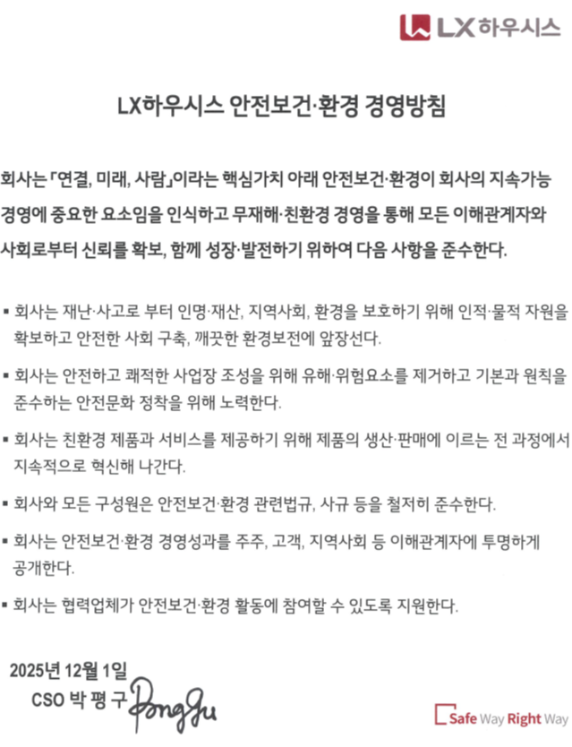 LX하우시스는 '사업 활동과 안전보건·환경과의 조화'라는 환경경영 비전을 달성하기 위해